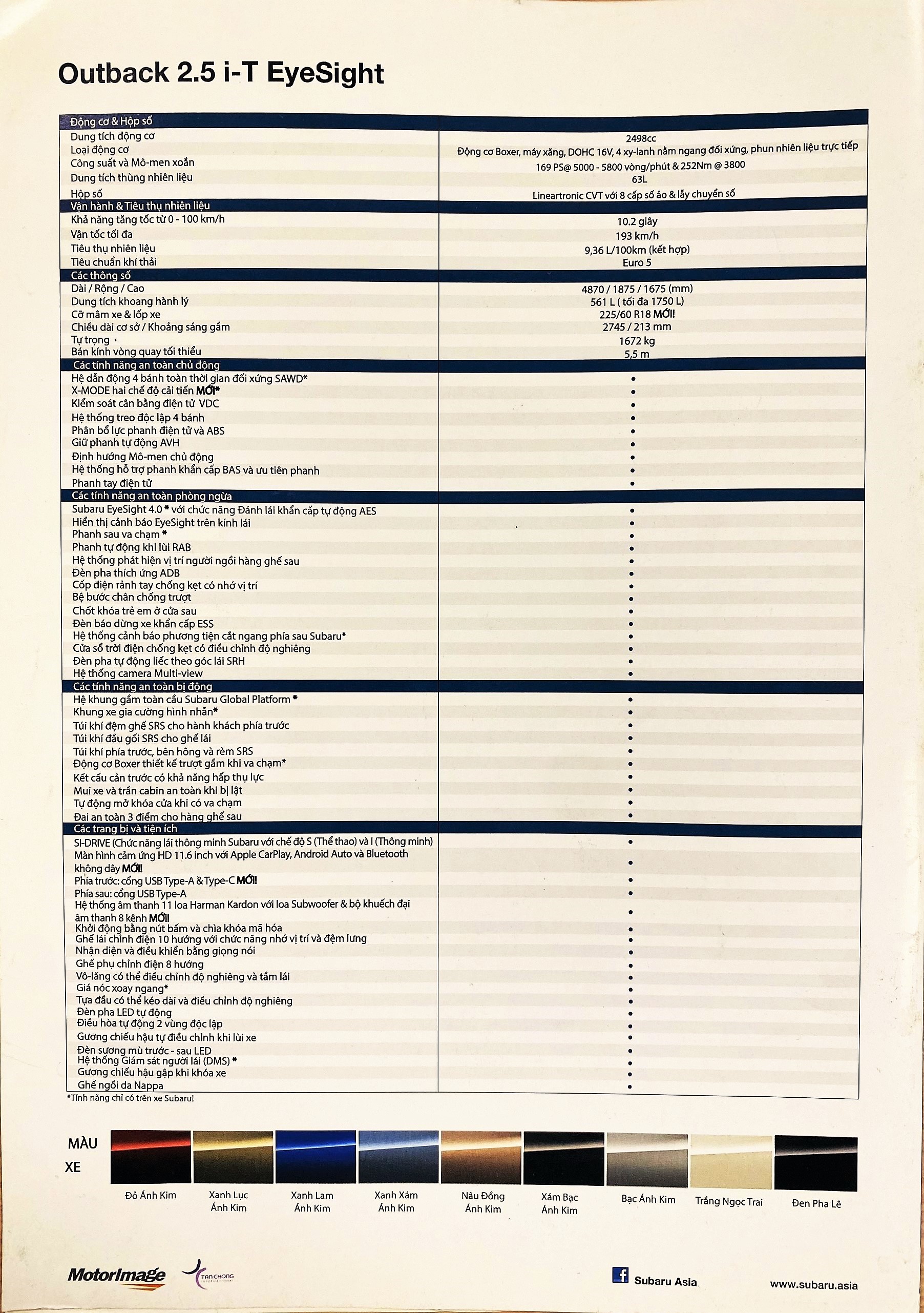 Khi mua Subaru Outback mới nhất năm 2025, khách hàng được lựa chọn giữa 7 màu sắc, bao gồm trắng ngọc trai, đen pha lê, xanh xám, xanh lam, xanh lục, xám bạc, nâu đồng và đỏ.